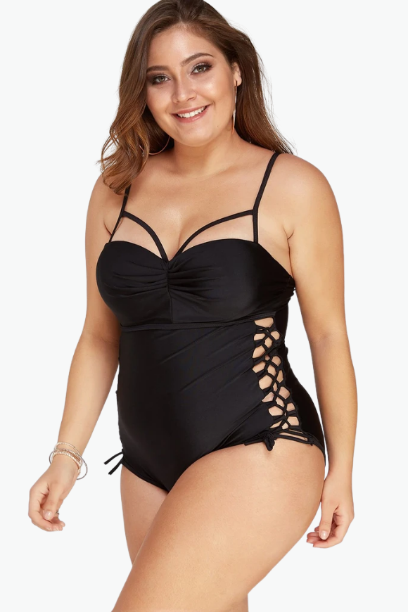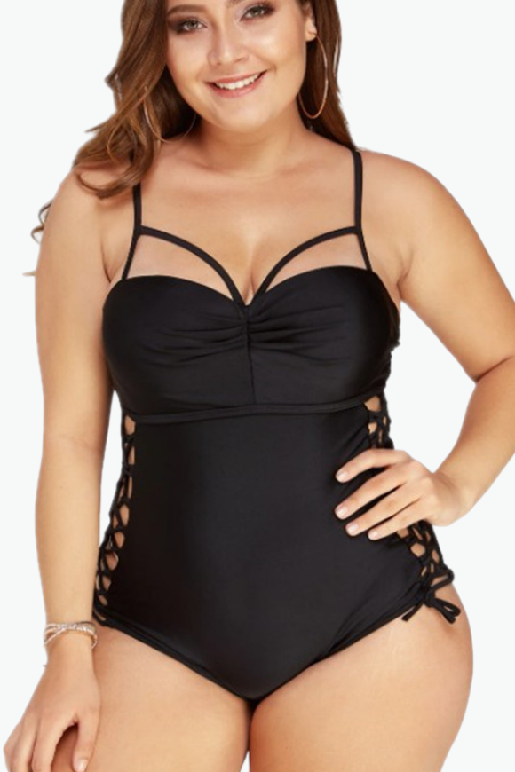 Black Rope Tie One Piece Plus Size Swimsuit