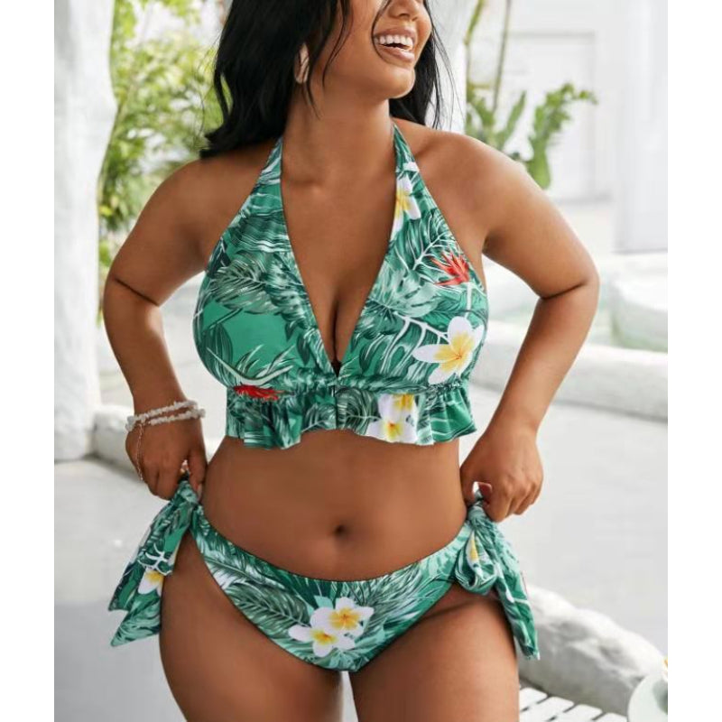 Halter Neck Flower Print Black Two Piece Plus Size Swimsuit