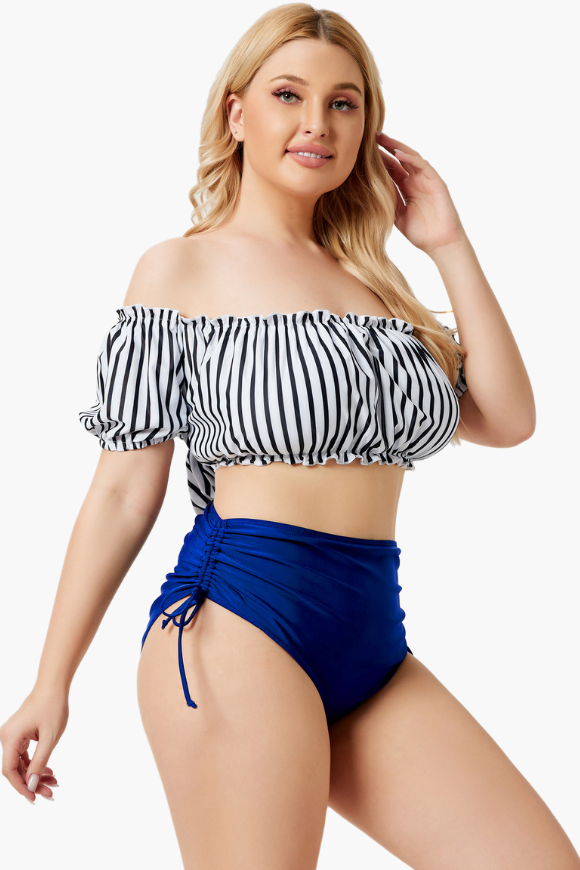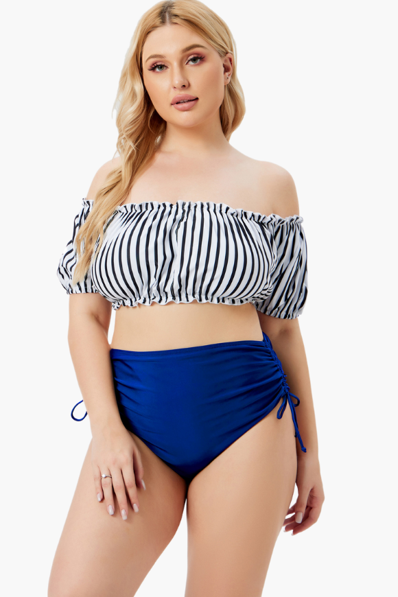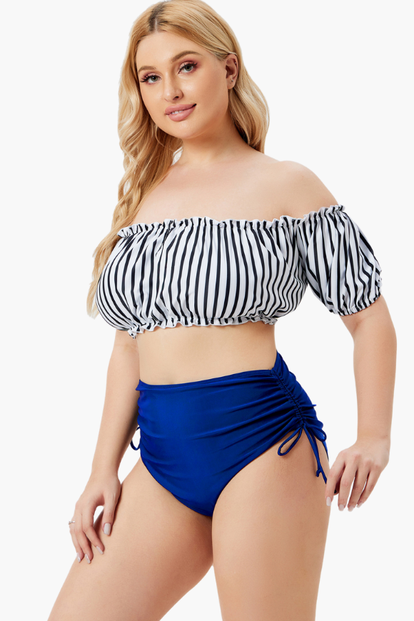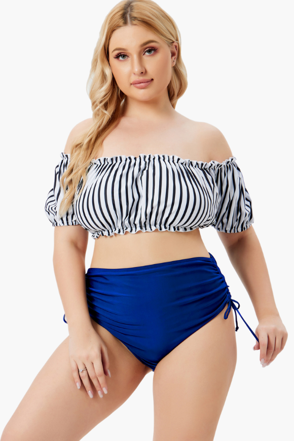 Bardot Neckline With Puffed Sleeves Two Piece Plus Size Swimsuit