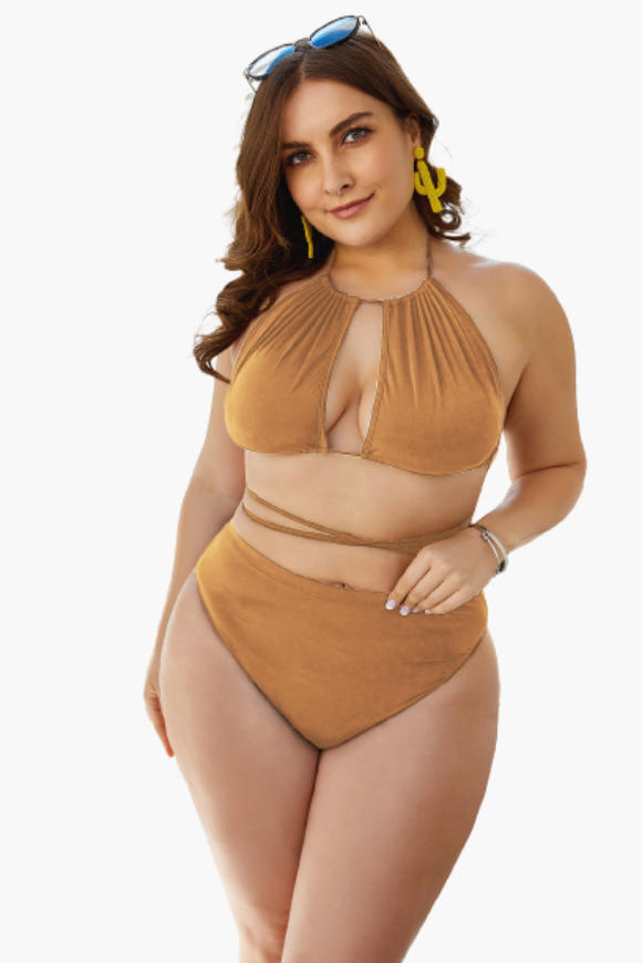 The Beige Tie-up Cutout Two Piece Plus Size Swimsuit is all you need to get through summer in style! Our plus size swimwear from Curvy Waves offer comfort and style combining with sexy prints and curve-hugging fit. With bold patterns that shout "summer's here" and sizes that go up to a 6XL, there's nowhere else to go bikini shopping for! Instantly lengthen the look of your legs with the high-cut hemline! Our bikinis are designed to make sure they fit you right. And by right, we mean no tummy rolls, no camel toes, no muffin tops, and absolutely no discomfort!