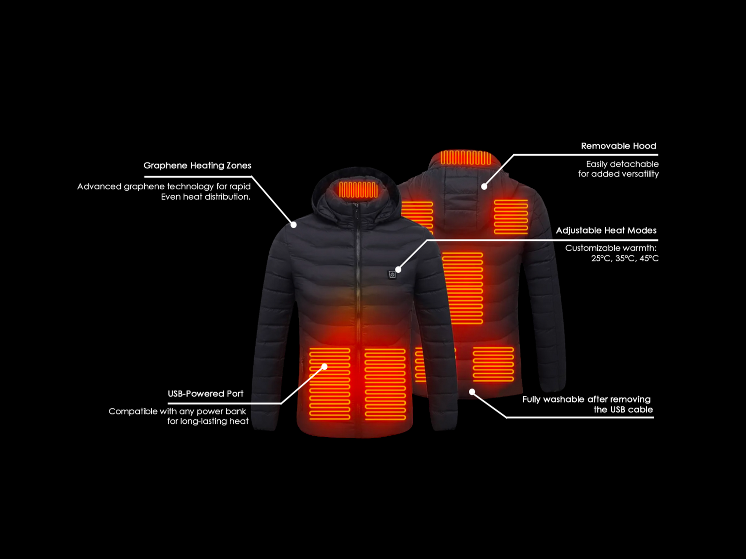 - Features multiple heating zones on the front and back, providing warmth to key areas for balanced heat distribution.