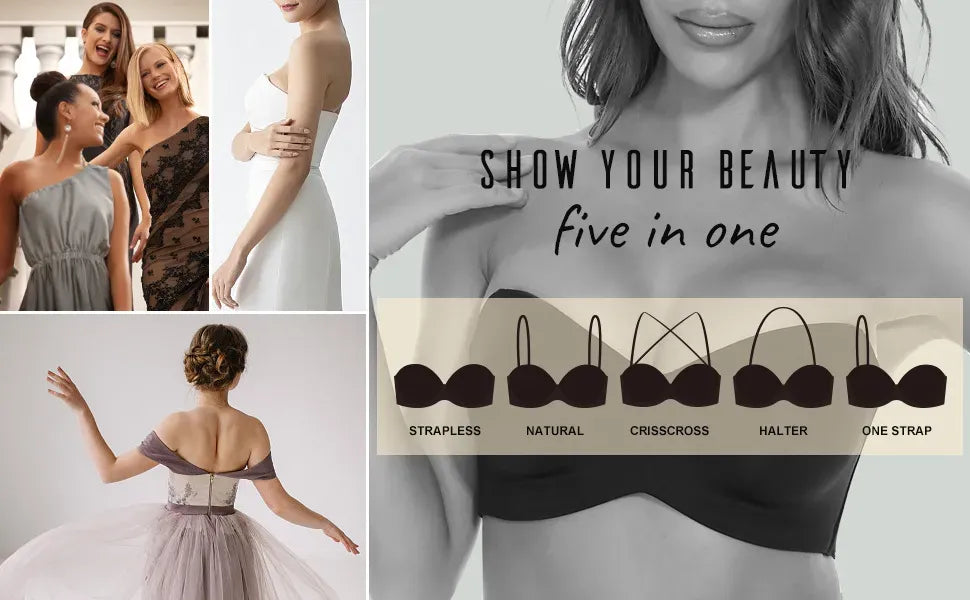 Detachable-Strap bra can convert into 5-ways: strapless, halter, cross back, single shoulder strap and conventional. Ideal for strapless dress, spaghetti straps tops, wediding and bridesmaid dresses, off-the-shoulder clothing, low cut t-shirts, ect.