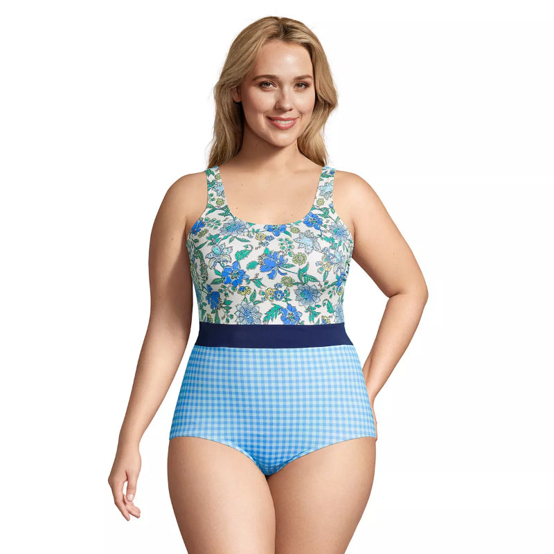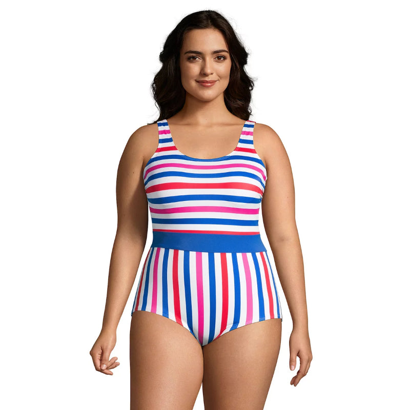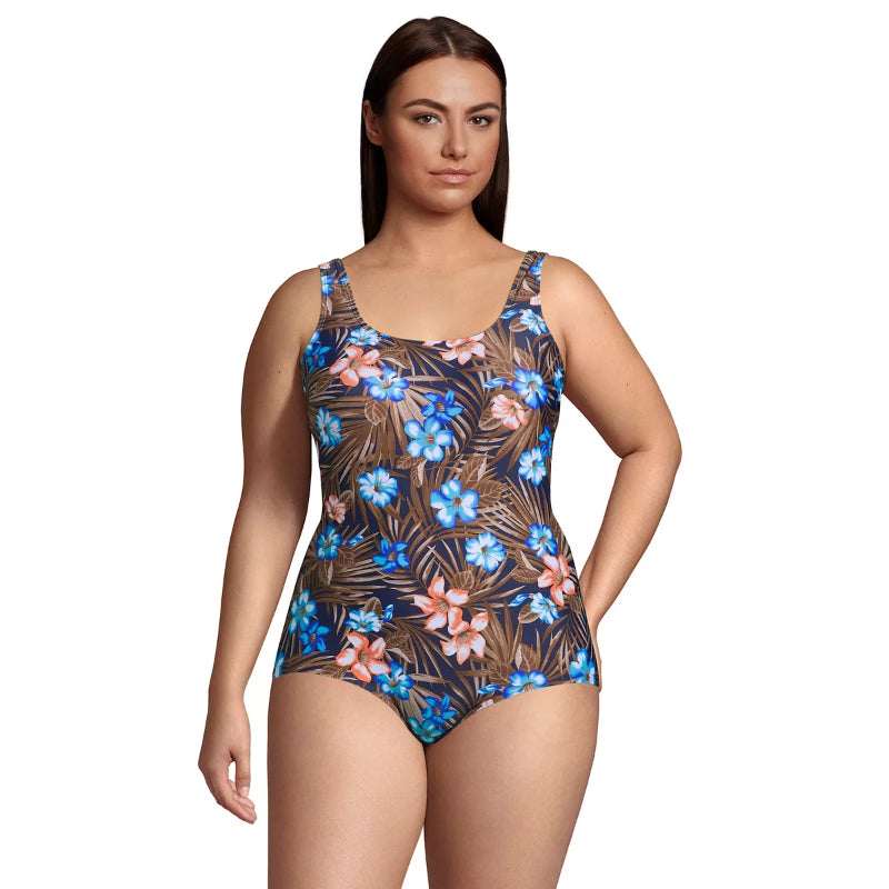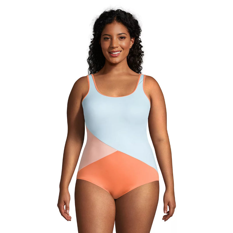 This One-Piece Swimsuit Plus Size Resistant Sporty Soft Cup is designed for lasting fit and feel. It features spandex which helps the suit last longer by resisting breakdown from chlorine, sunscreen, UV rays, and sweat. The suit also offers UPF 50 sun protection, a scoop neck, and is lined. The Tugless design offers a flattering, fuss-free fit and is available in a long torso. The swimsuit also includes a bust minimizer and soft cups and is suitable for medium-impact activities. It is made of Nylon spandex and should be hand washed.