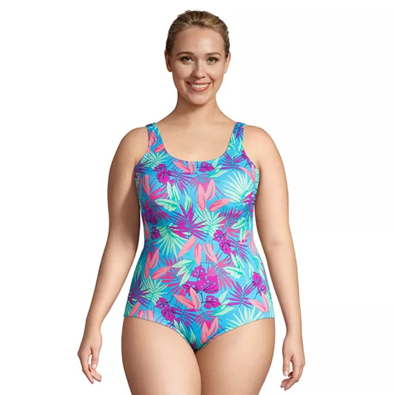 This One-Piece Swimsuit Plus Size Resistant Sporty Soft Cup is designed for lasting fit and feel. It features spandex which helps the suit last longer by resisting breakdown from chlorine, sunscreen, UV rays, and sweat. The suit also offers UPF 50 sun protection, a scoop neck, and is lined. The Tugless design offers a flattering, fuss-free fit and is available in a long torso. The swimsuit also includes a bust minimizer and soft cups and is suitable for medium-impact activities. It is made of Nylon spandex and should be hand washed.