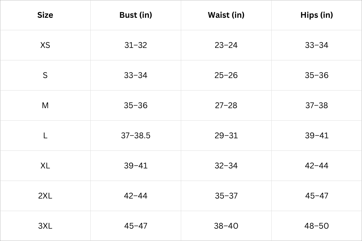Size Chart (Inches):