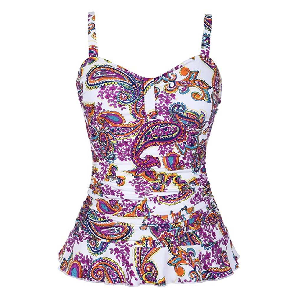 This Retro Ruched Tankini Swimsuit features pleats in the bust area that accentuate your figure and a ruffled hem that add a flirty touch. The mid-section is ruched to provide tummy control and features a vintage palm print. The swimwear has a wire-free built-in supportive bra and adjustable straps. The ruching on the midsection also provides tummy control. The vintage palm print gives the swimwear a stylish look. Many design patterns are available.