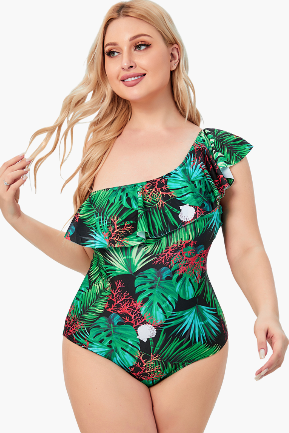 The Ruffle One Shoulder Two Piece Plus Size Swimsuit is all you need to get through summer in style! Our plus size swimwear from Curvy Waves offer comfort and style combining with sexy prints and curve-hugging fit. With bold patterns that shout "summer's here" and sizes that go up to a 6XL, there's nowhere else to go bikini shopping for! Instantly lengthen the look of your legs with the high-cut hemline! Our bikinis are designed to make sure they fit you right. And by right, we mean no tummy rolls, no camel toes, no muffin tops, and absolutely no discomfort!