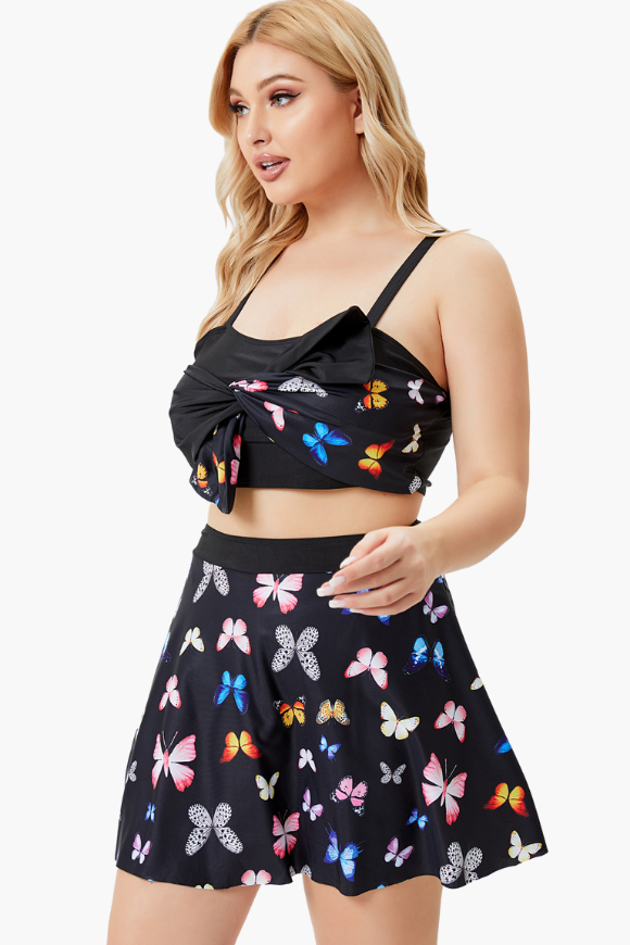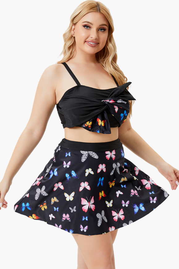 Skirt Bottom Butterfly Print Black Two Piece Plus Size Swimsuit