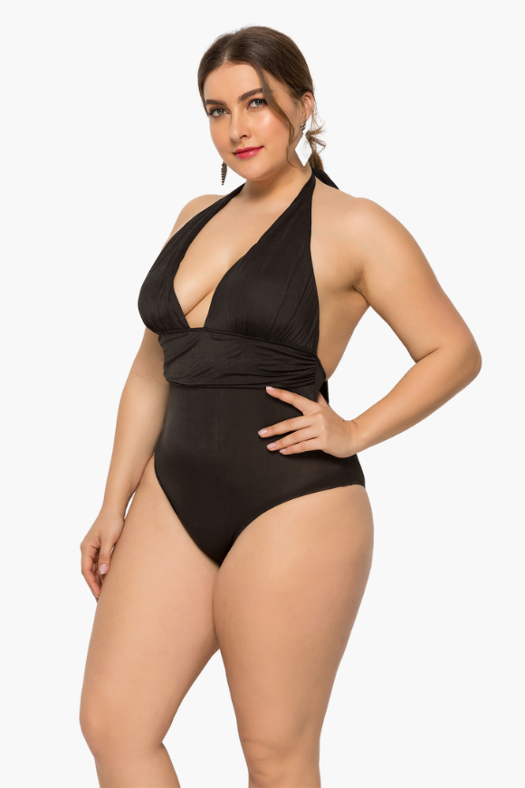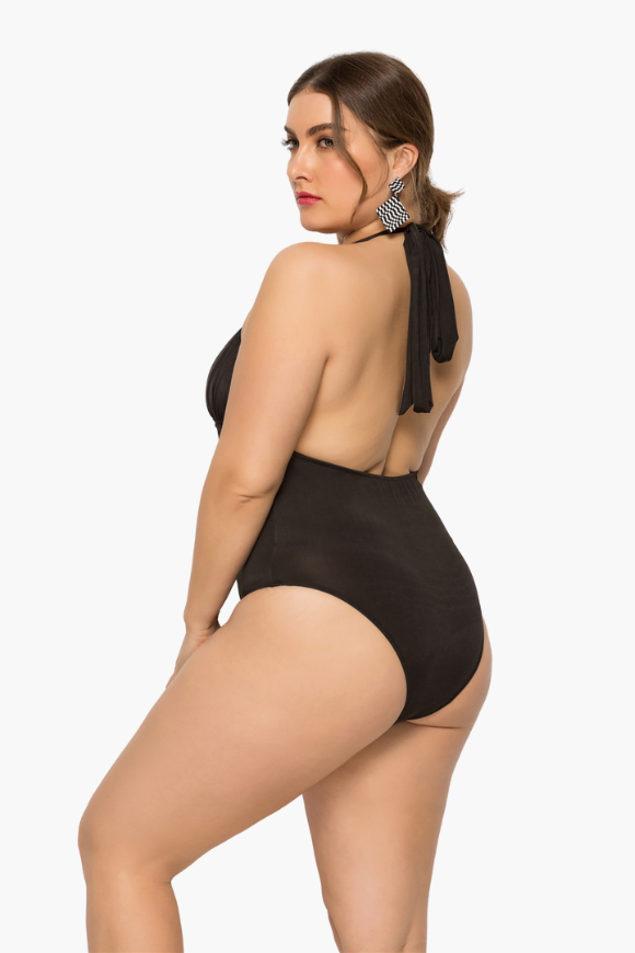 The Solid Black Halter One Piece Plus Size Swimsuit is all you need to get through summer in style! Our plus size swimwear from Curvy Waves offer comfort and style combining with sexy prints and curve-hugging fit. With bold patterns that shout "summer's here" and sizes that go up to a 6XL, there's nowhere else to go bikini shopping for! Instantly lengthen the look of your legs with the high-cut hemline! Our bikinis are designed to make sure they fit you right. And by right, we mean no tummy rolls, no camel toes, no muffin tops, and absolutely no discomfort!