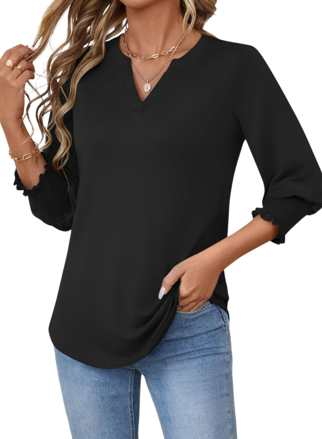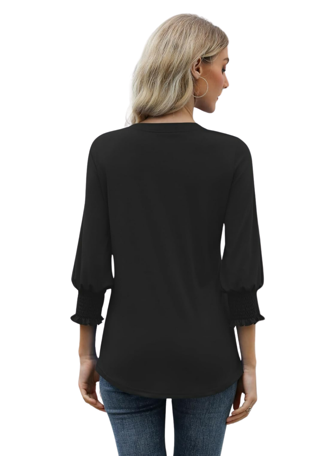 The 3/4 sleeves with a small gathered section provide a modest finish. This Blouse with Sleeves is well-suited for indoor air-conditioned spaces or breezy outdoor setups. The sleeve shape adds depth without the need for additional elements.