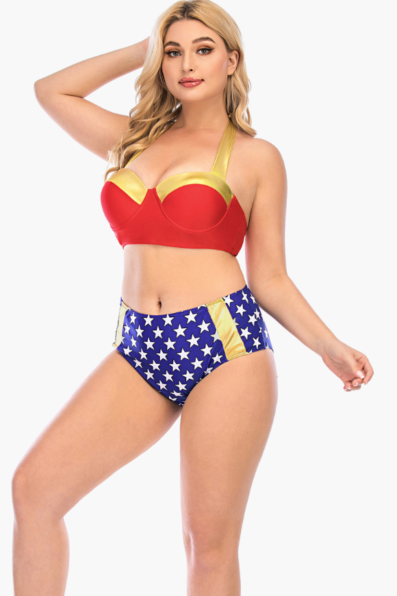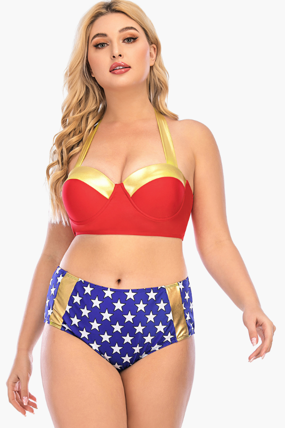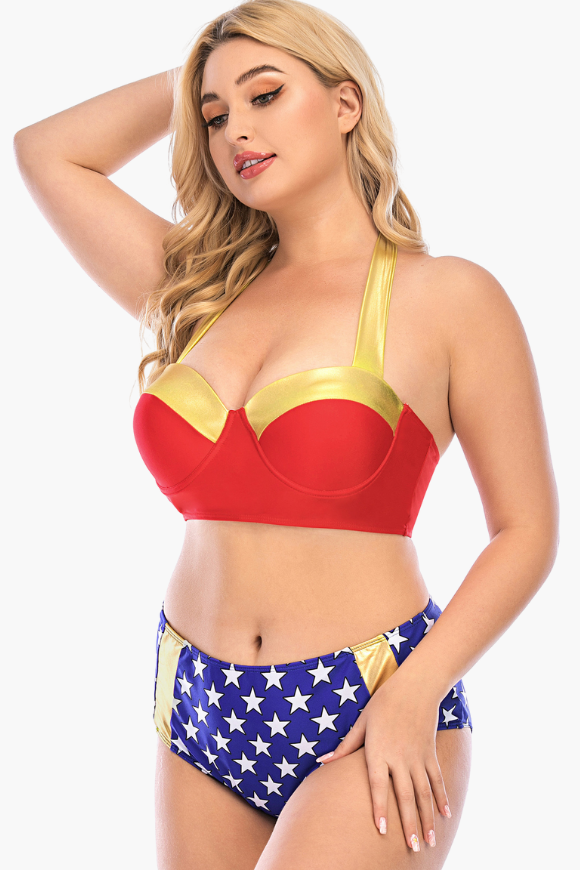 The Sweetheart Underwired Halter Neck Two Piece Plus Size Swimsuit is all you need to get through summer in style! Our plus size swimwear from Curvy Waves offer comfort and style combining with sexy prints and curve-hugging fit. With bold patterns that shout "summer's here" and sizes that go up to a 6XL, there's nowhere else to go bikini shopping for! Instantly lengthen the look of your legs with the high-cut hemline! Our bikinis are designed to make sure they fit you right. And by right, we mean no tummy rolls, no camel toes, no muffin tops, and absolutely no discomfort!