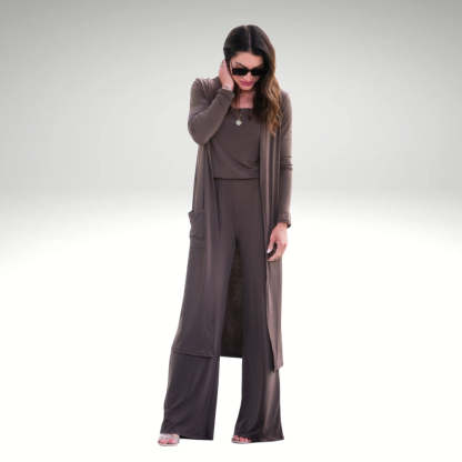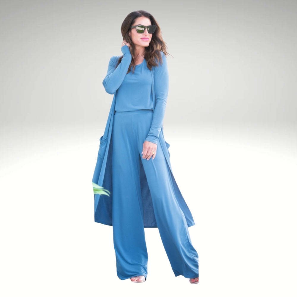 Versatile Three-Piece Design: Includes a tank top, wide-leg pants with an elastic waistband, and a long open-front cardigan to provide a complete and cohesive look.