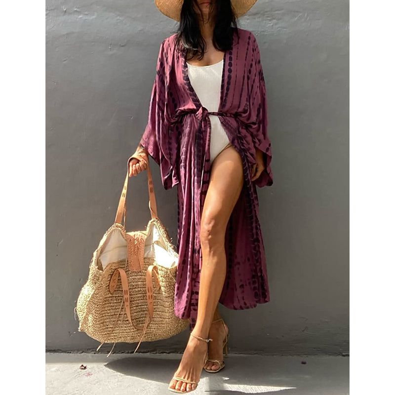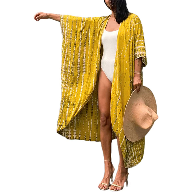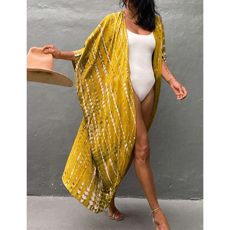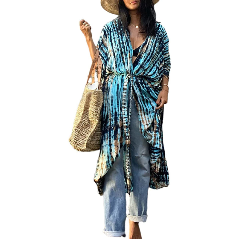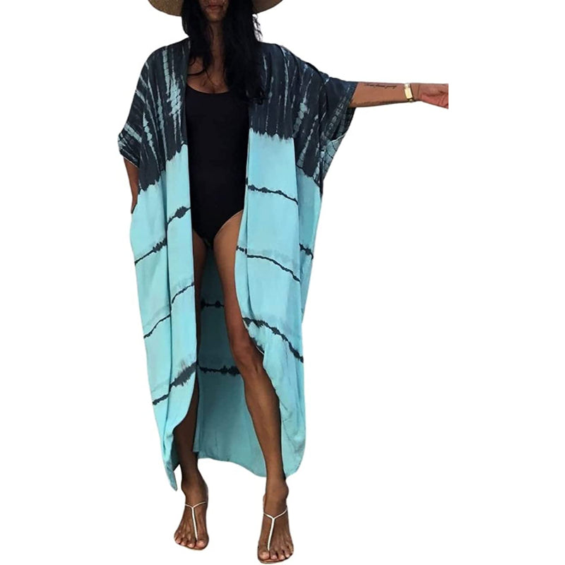 This Tie Dye Open Front Long Kimono Swimsuit Cover Up will be your go-to for a beach day. The open front style and long length create a breezy, relaxed vibe that is perfect for a day in the sun. The bright, bold tie-dye pattern adds a fun, playful energy to any outfit. The lightweight and breathable fabric make it comfortable and easy to wear, while the side slits add a touch of femininity and grace. Whether you're headed to the beach or want to add a unique touch to your wardrobe, this kimono swimsuit cover-up is a perfect choice.