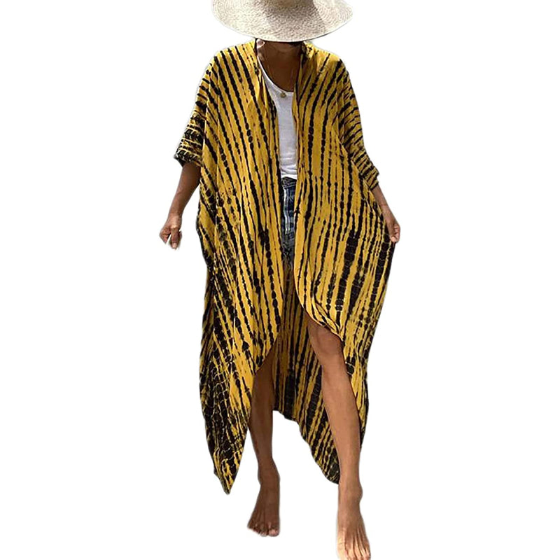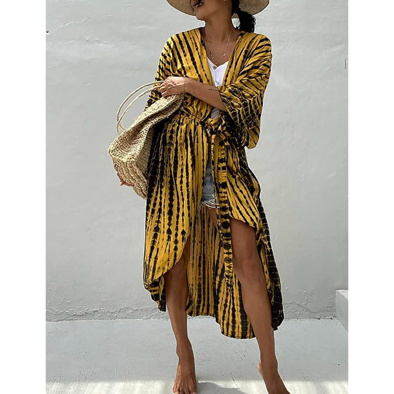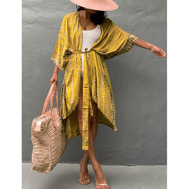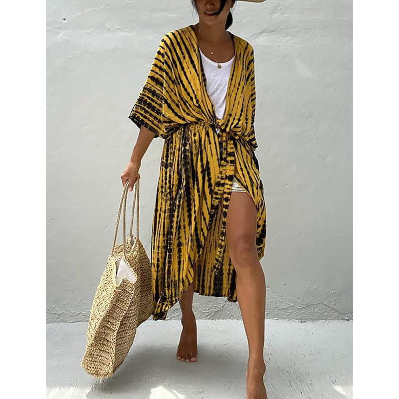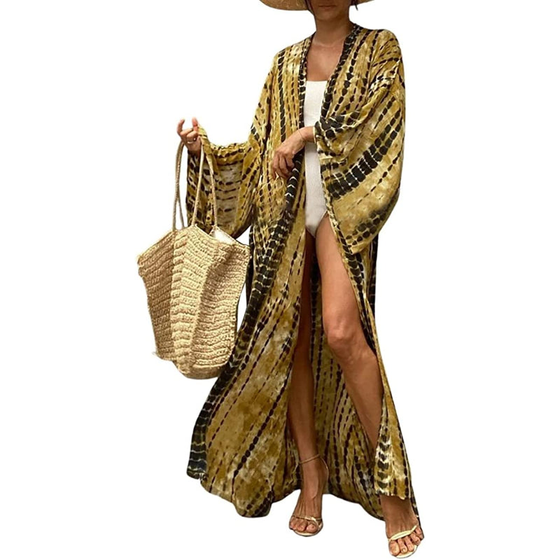 This Tie Dye Open Front Long Kimono Swimsuit Cover Up will be your go-to for a beach day. The open front style and long length create a breezy, relaxed vibe that is perfect for a day in the sun. The bright, bold tie-dye pattern adds a fun, playful energy to any outfit. The lightweight and breathable fabric make it comfortable and easy to wear, while the side slits add a touch of femininity and grace. Whether you're headed to the beach or want to add a unique touch to your wardrobe, this kimono swimsuit cover-up is a perfect choice.