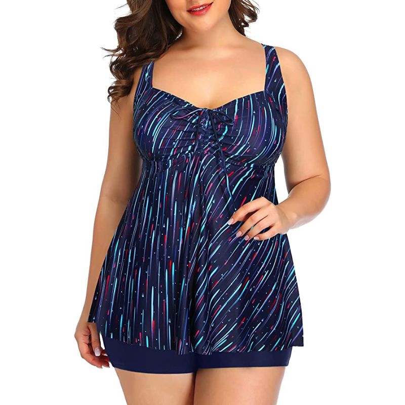 This Women's 2 Piece Flowy Bathing Suit features a tankini top that comes with boy shorts. The top has a padded push-up bra, adjustable shoulder straps, and a cute bowknot. The flyaway design of the bathing suit has a flattering fit and slimming flare silhouette that can hide the belly. The V-neckline has modest coverage and doesn't reveal too much. The swimsuit top has a tie knot, which you can adjust to give you a personalized fit. The boyleg bottom offers full coverage. Made of 85% Polyester and 15% Spandex, it is perfectly soft on the skin and comfortable to wear. Perfect for most occasions such as swimming pools, beach parties, vacations, and hot spring baths. Available in multiple US sizes and design patterns.