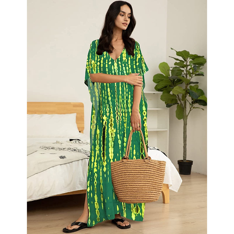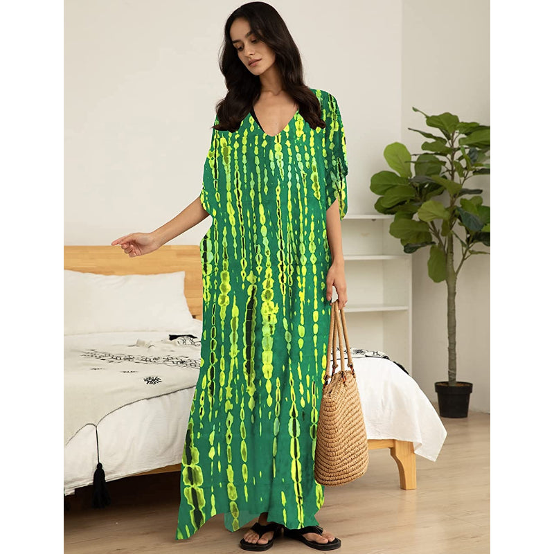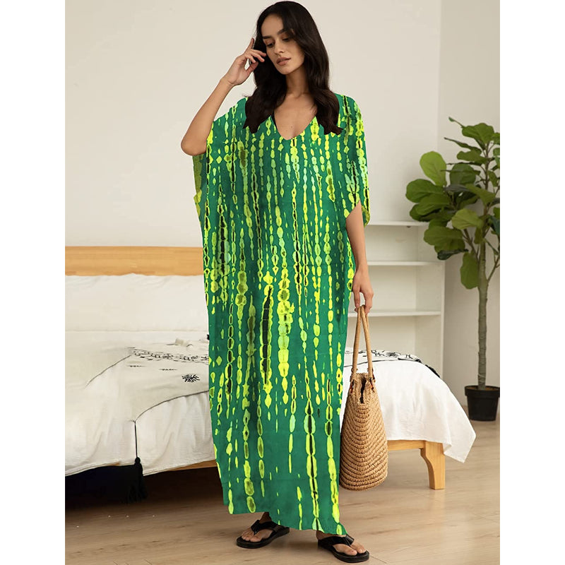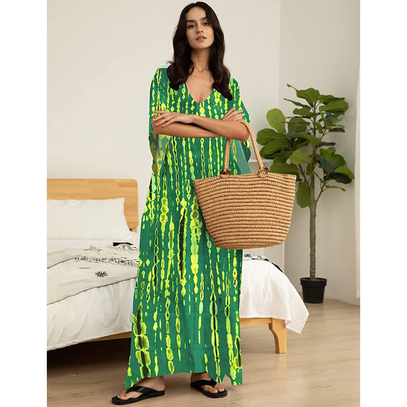 The exquisite Indonesian hand-dying technique was used to make the Women's Printed Short Sleeve Kaftan Cover Up Dress For Beach Suits. Your attire will look more stylish as a result. It may be worn both during the day as a stunning beach cover-up for your swimsuit and at night as a dazzling evening gown. Because of the fabric's wiggling, the fit is fashionable and loose. really light, comfy, and fluffy. It might also be a fantastic gift!
