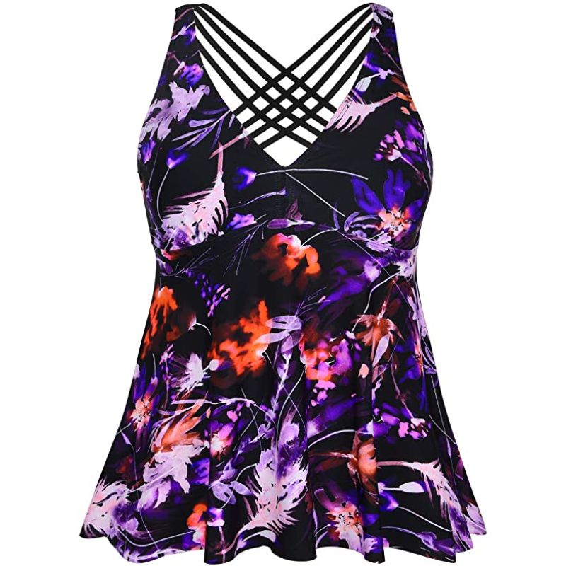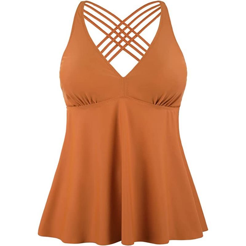 Women's Retro Swimwear features multi straps crisscrossing at the back, keeping the straps on the shoulder while participating in sports. It's a flattering swimsuit for women. The top includes a built-in soft wire-free bra with full coverage and non-adjustable straps. The wide straps provide full bust support. The fit and flare silhouette and flowy hem can conceal tummy fat well. It is an unhemmed, and solid modest tankini top that is easy to match with any swim shorts, briefs, or bottom. Please note that the sizes of this swim top are larger than average, we recommend ordering one size smaller.
