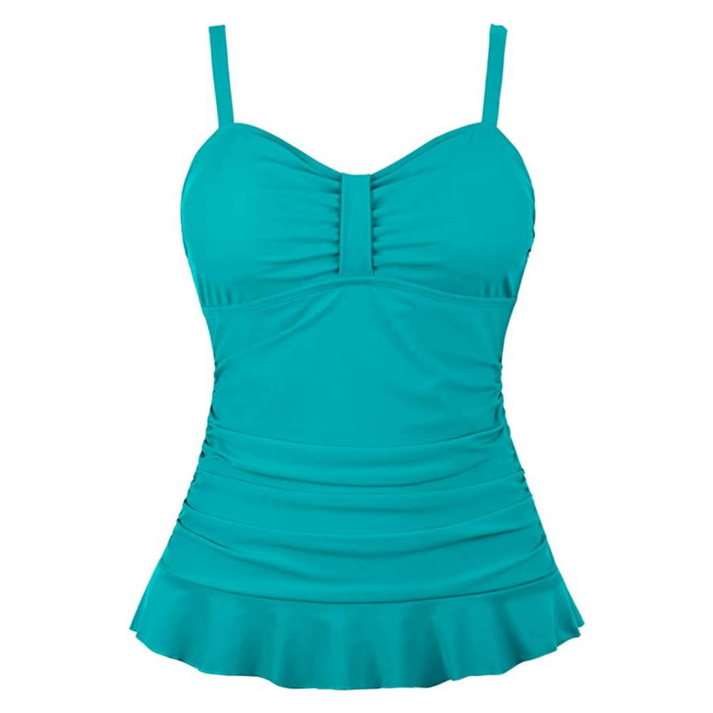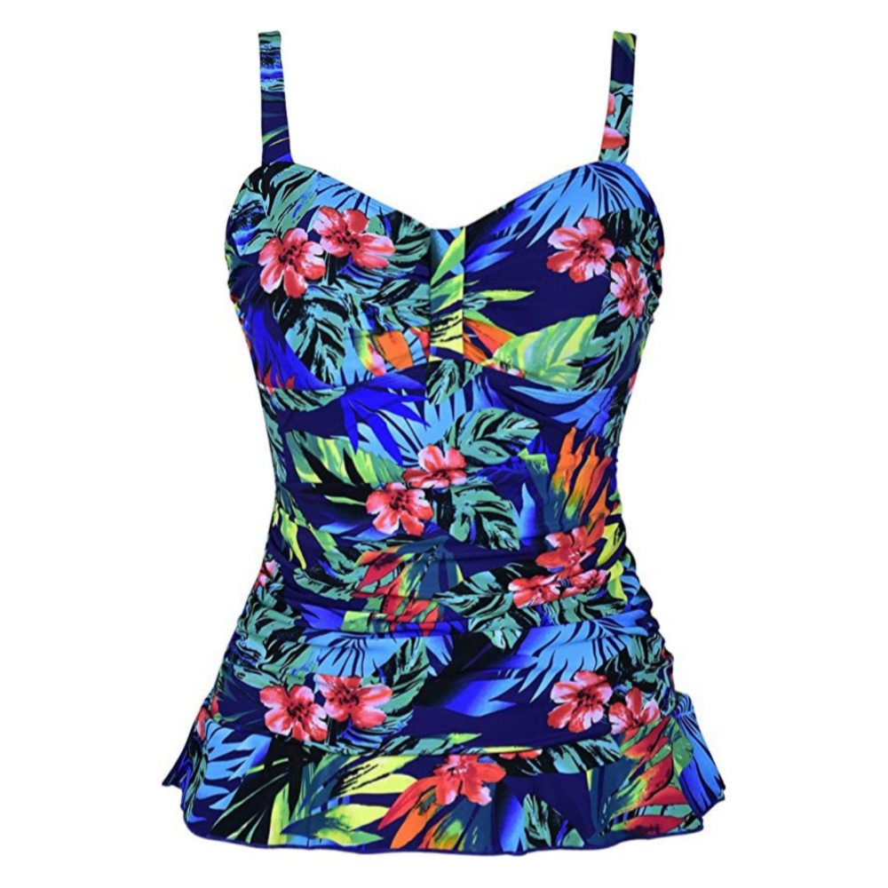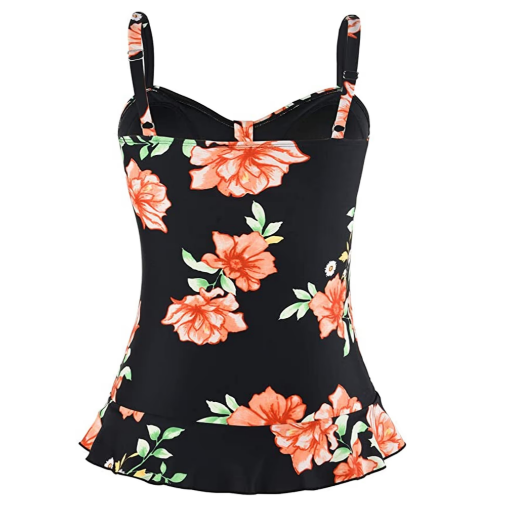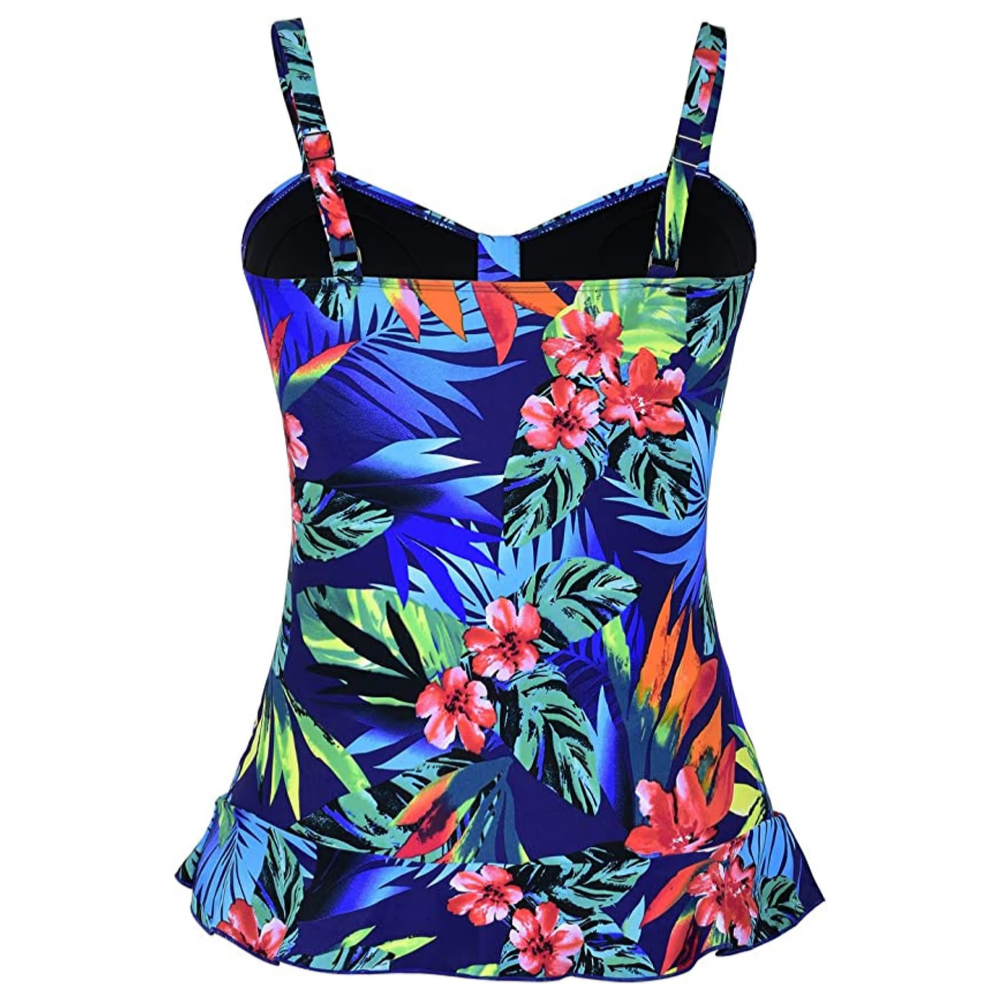 This Women's Tankini Swimsuit features pleats in the bust area that accentuate your figure and a ruffled hem that add a flirty touch. The mid-section is ruched to provide tummy control and features a vintage palm print. The swimwear has a wire-free built-in supportive bra and adjustable straps. The ruching on the midsection also provides tummy control. Many design patterns are available.