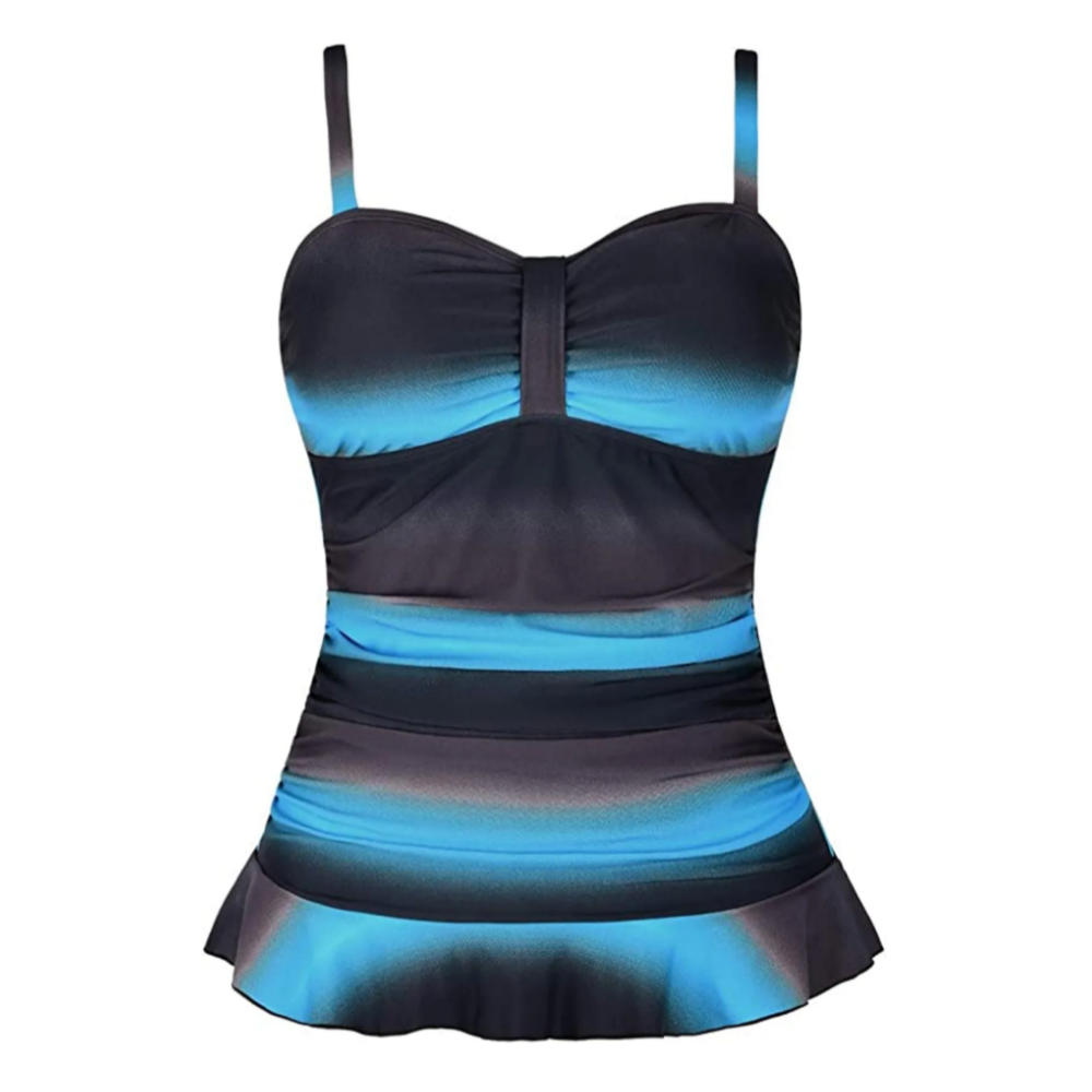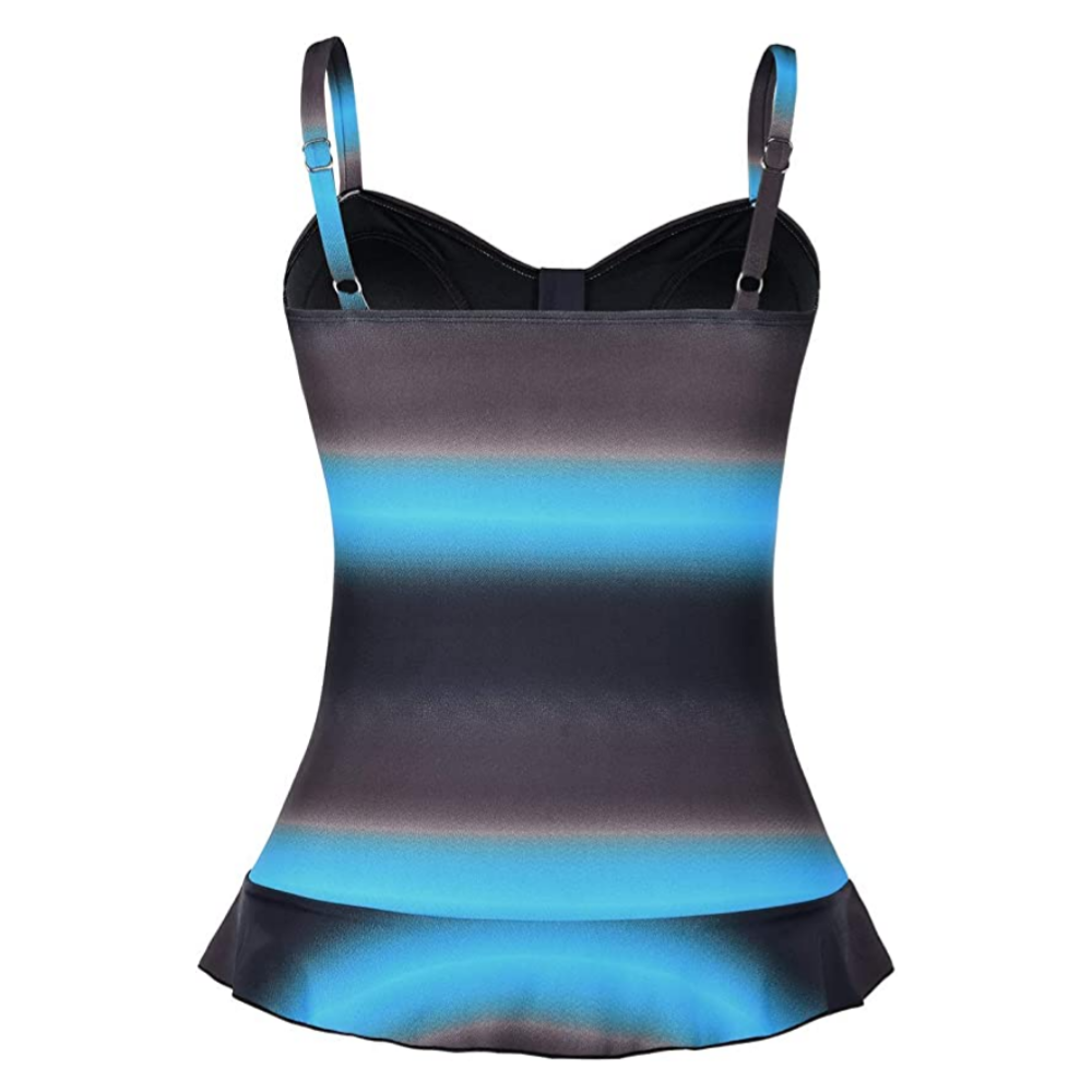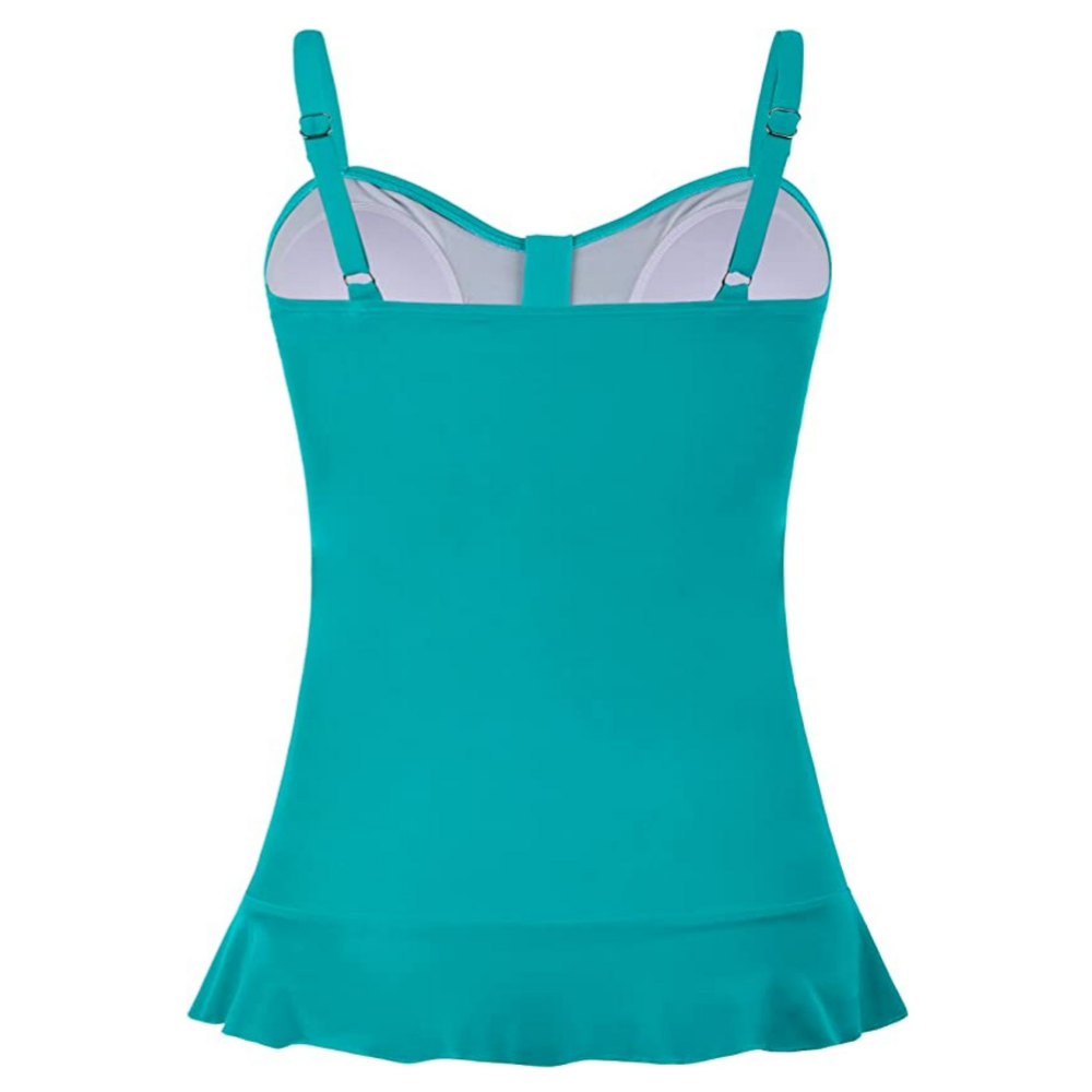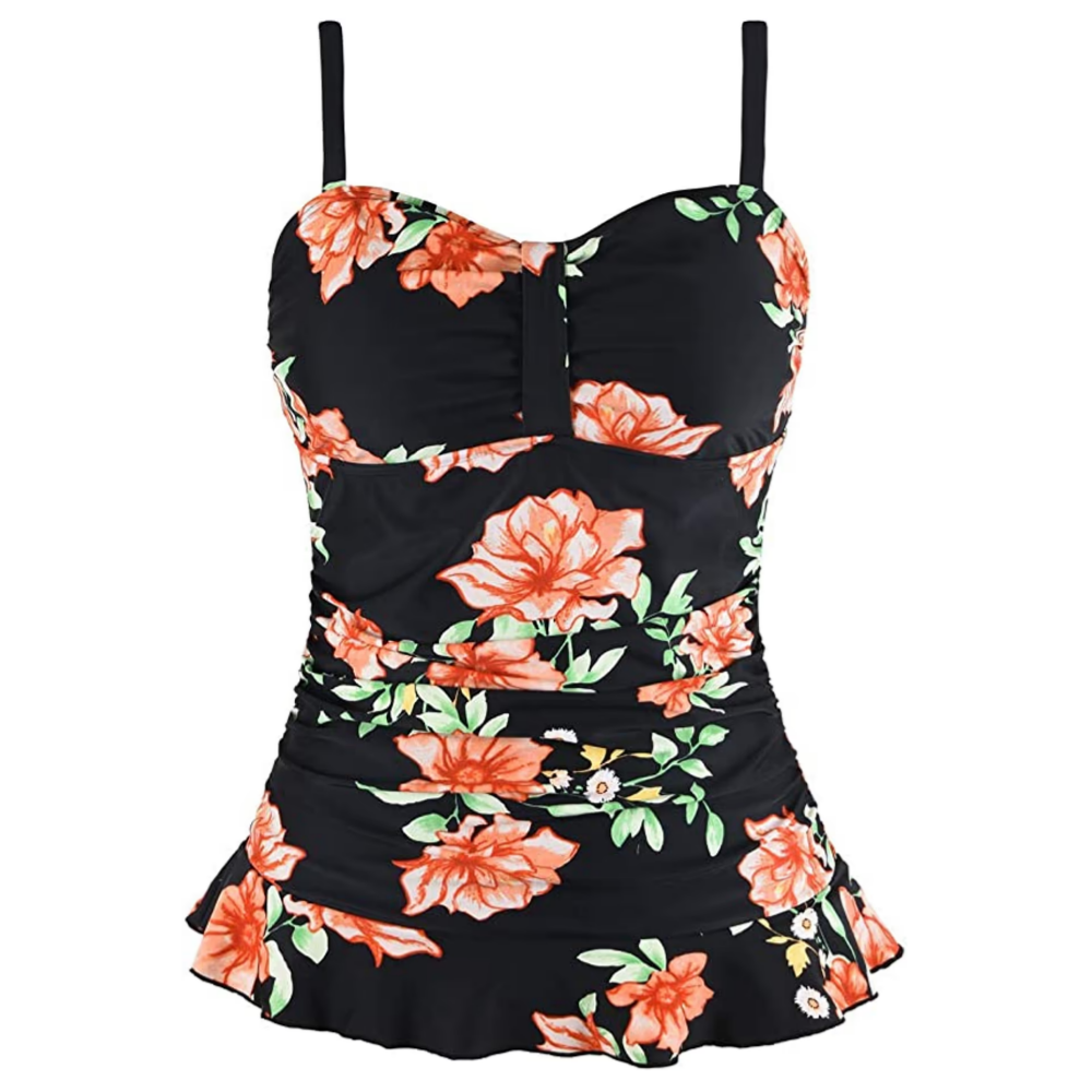 This Women's Tankini Swimsuit features pleats in the bust area that accentuate your figure and a ruffled hem that add a flirty touch. The mid-section is ruched to provide tummy control and features a vintage palm print. The swimwear has a wire-free built-in supportive bra and adjustable straps. The ruching on the midsection also provides tummy control. Many design patterns are available.